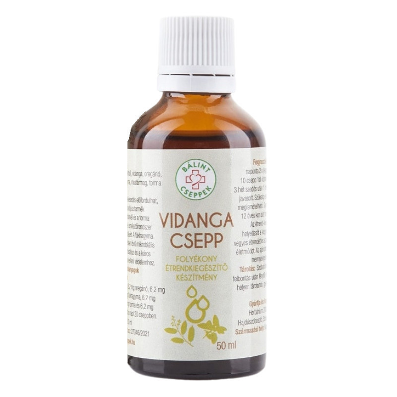 TÁPANYAGOK / HATÓANYAGOK A NAPI ADAGBAN: 18,7 mg vidanga, 6,2 mg oregánó, 6,2 mg olajfalevél, 6,2 mg fokhagyma, 6,2 mg mustármag, 6,2 mg torma és 6,2 mg kakukkfű található a napi 20 cseppben.